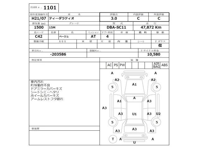 Аукцион NISSAN Osaka Дата аукциона 12.01.2026 Год2009 Тип кузоваСедан Номер кузоваSC11 Объем1500 сс Трансмиссия Автомат Привод Автомат Пробег 47 000 км Цветбежевый Оценка3