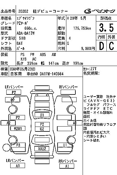 Аукцион BAYAUC Дата аукциона 22.10.2025 Год2017 Номер кузоваDA17W Объем660 сс Трансмиссия DAT Привод FR,FULLTIME4WD Пробег 177 000 км Цветбелый Оценка3.5