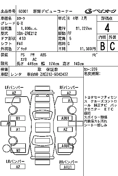 Аукцион BAYAUC Дата аукциона 14.01.2026 Год2022 Тип кузоваСедан Номер кузоваZRE212 Объем1800 сс Трансмиссия FAT Привод Автомат Пробег 82 000 км Цветчерный Оценка4