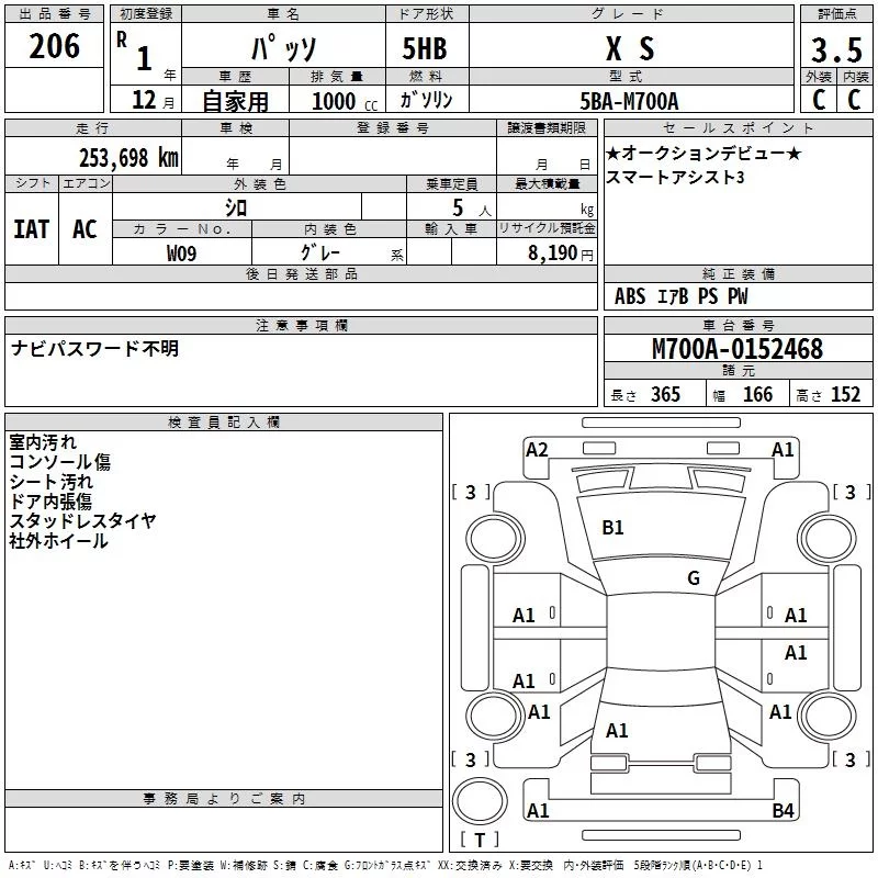 Аукцион TAA Shikoku Дата аукциона 13.01.2026 Год2019 Тип кузоваХэтчбек Номер кузоваM700A Объем1000 сс Трансмиссия IAT Привод Автомат Пробег 254 000 км Цветбелый Оценка3.5