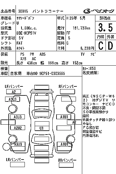 Аукцион BAYAUC Дата аукциона 21.01.2026 Год2013 Тип кузоваУниверсал Номер кузоваNCP51V Объем1500 сс Трансмиссия FAT Привод Автомат Пробег 182 000 км Цветбелый Оценка3.5