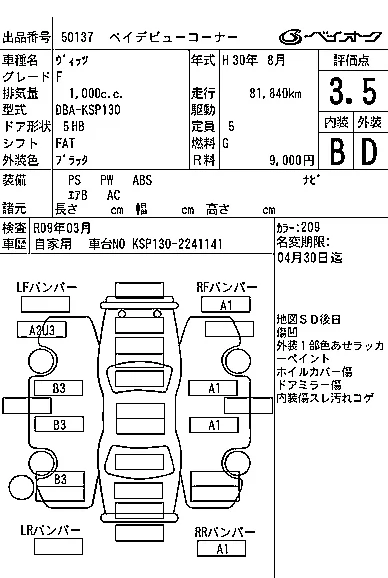 Аукцион BAYAUC Дата аукциона 01.04.2026 Год2018 Тип кузоваХэтчбек Номер кузоваKSP130 Объем1000 сс Трансмиссия FAT Привод Автомат Пробег 82 000 км Цветчерный Оценка3.5