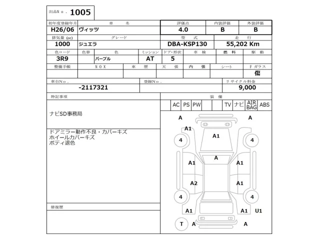 Аукцион NISSAN Osaka Дата аукциона 06.04.2026 Год2014 Тип кузоваХэтчбек Номер кузоваKSP130 Объем1000 сс Трансмиссия Автомат Привод Автомат Пробег 55 000 км Цветфиолетовый Оценка4