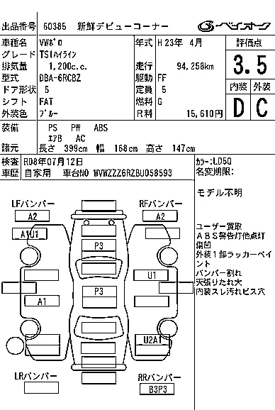 Аукцион BAYAUC Дата аукциона 25.02.2026 Год2011 Тип кузоваХэтчбек Номер кузова6RCBZ Объем1200 сс Трансмиссия FAT Привод Автомат Пробег 95 000 км Цветсиний Оценка3.5